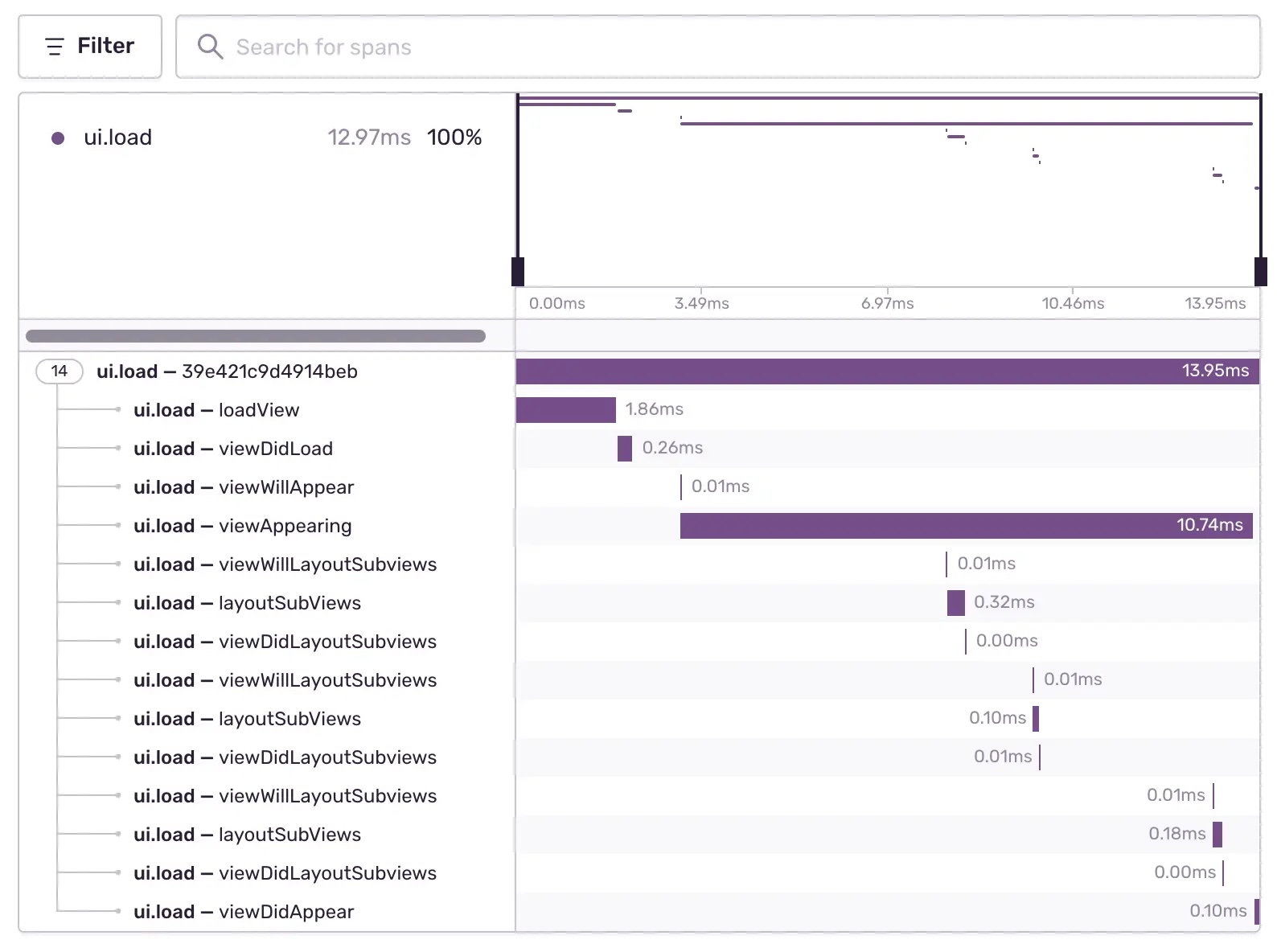 When you use Sentry to measure the performance of a UIKit app, every view controller and UIView will automatically be traced. Without any setup you can spot view controllers that are slow to load or to layout their views.